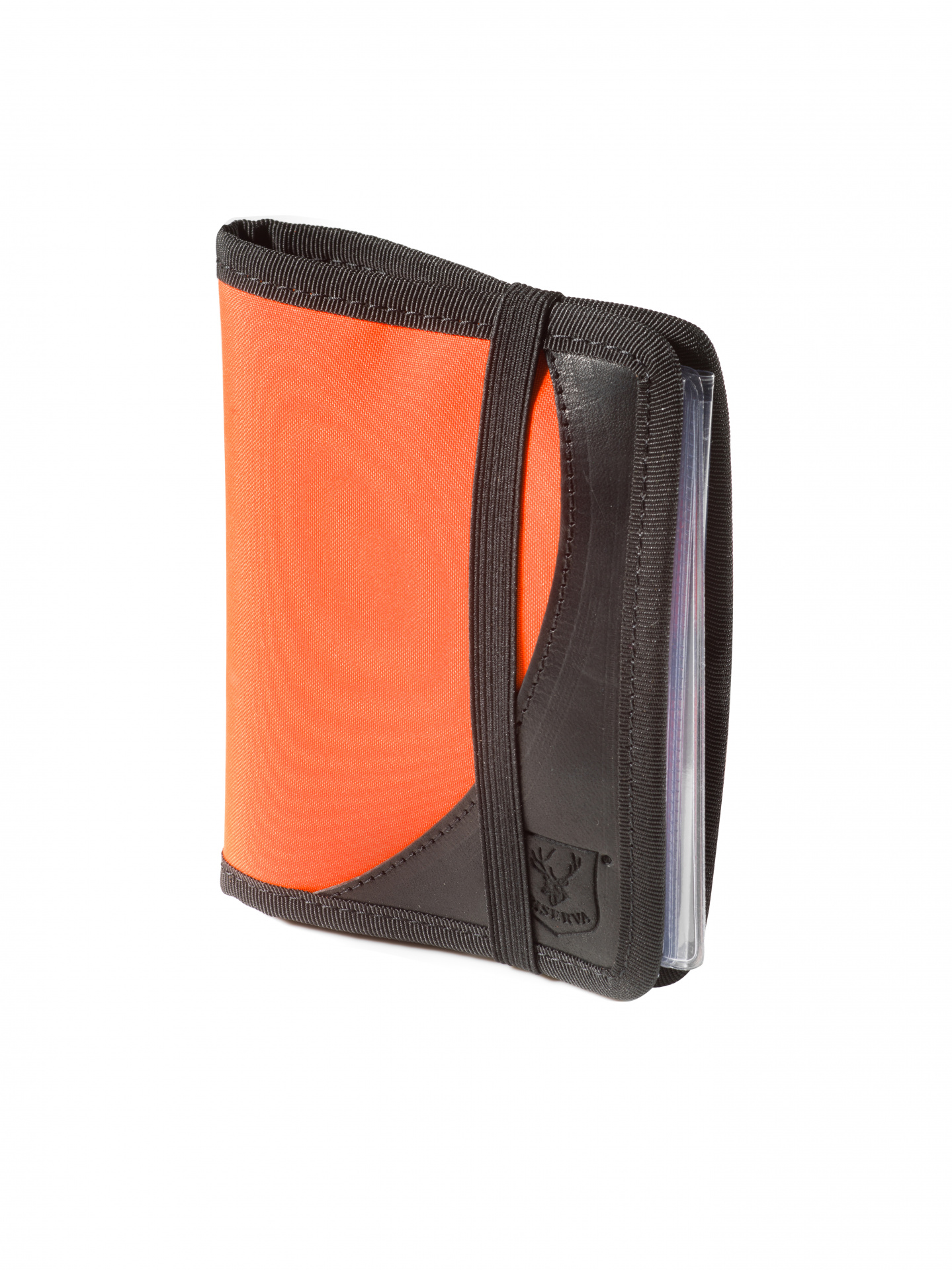 Porta licenza arancione alta visibilità piatto e compatto, con dettagli in pelle nera, con inserti porta documenti intercambiabili in plastica e porta penna.